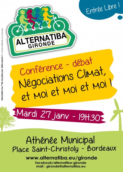 Alternatiba Gironde organise une soirée débat pour faire le point sur les négociations climat, après la conférence de LIMA (COP 20) et avant la conférence « décisive » de PARIS (COP 21).